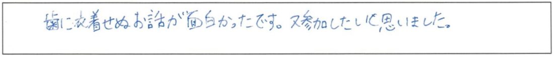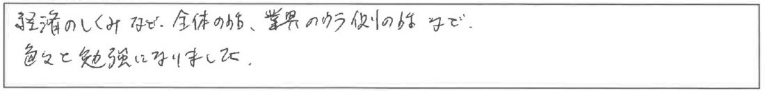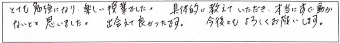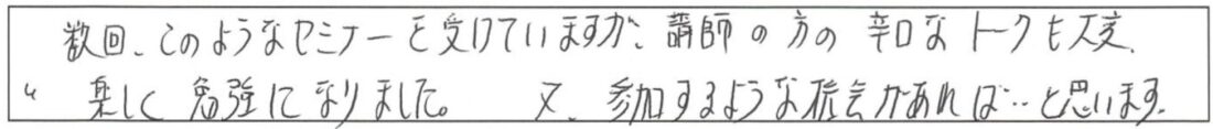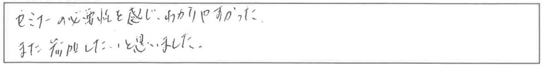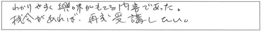 資料のメモを取りたかったが時間が足りなかった。時間と内容において満足しております。