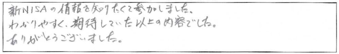 IFAiDeCoNISA企業型確定拠出年金(401k)投資信託初心者向けマネー講座~NISA・iDeCoのメリット&デメリット~新NISAの情報を知りたくて参加しました。わかりやすく、期待していた以上の内容でした。ありがとうございました。