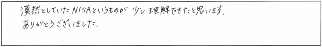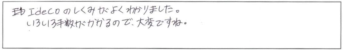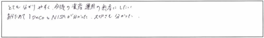 IFAiDeCoNISA企業型確定拠出年金(401k)投資信託初心者向けマネー講座~NISA・iDeCoのメリット&デメリット~自分が何を優先すべきかわかりました。お話しがわかりやすく、おもしろかったです。ありがとうございました。