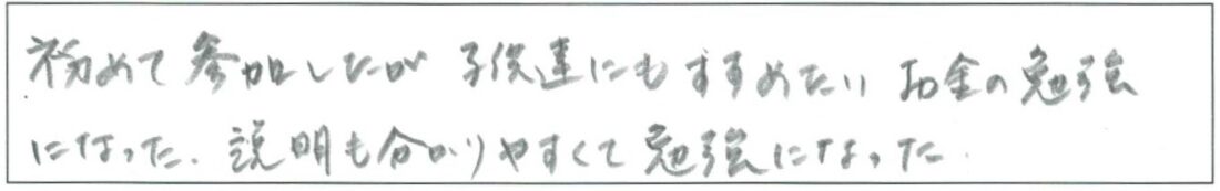 保険の選び方老後資金資産運用初心者超初心者向け「マネープラン基礎講座」 資産運用の基礎をマスター!初めて参加したが子供達にもすすめたいお金の勉強になった。説明も分かりやすくて勉強になった。