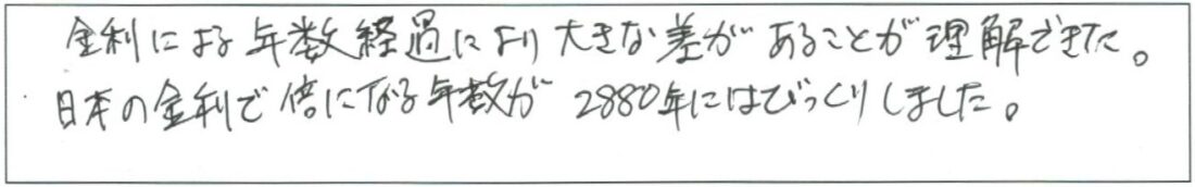 保険の選び方老後資金資産運用初心者超初心者向け「マネープラン基礎講座」 資産運用の基礎をマスター!金利による年数経過により大きな差があることが理解できた。日本の金利で倍になる年数が2880年にはびっくりしました。