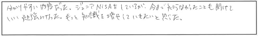 IFAiDeCoNISA企業型確定拠出年金(401k)投資信託新しいNISA 丸わかり活用術!~NISA・iDeCoのメリット&デメリット~楽しく学べ、とても勉強になりました。ありがとうございました。