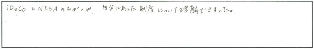 IFAiDeCoNISA企業型確定拠出年金(401k)投資信託新しいNISA 丸わかり活用術!~NISA・iDeCoのメリット&デメリット~開催時間・場所等都合が良く、無料で受講でき非常にためになりました。ありがとうございました。