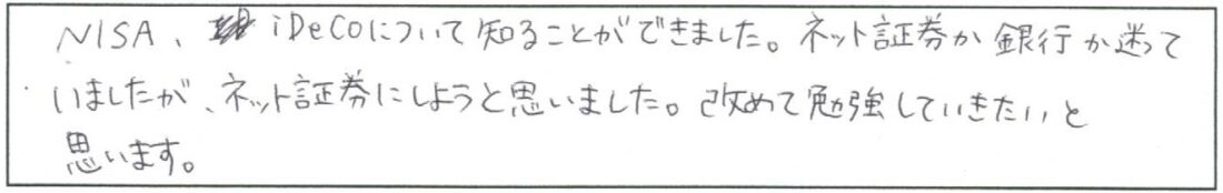 IFAiDeCoNISA企業型確定拠出年金(401k)投資信託初心者向けマネー講座~NISA・iDeCoのメリット&デメリット~資産運用、早い方がよいということで、早めに取り組みたいと思います。楽しく学べてよかったです。ありがとうございました。
