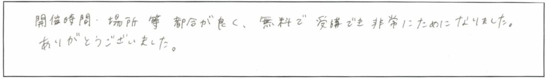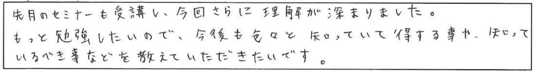 同じ内容でも対面で2時間の講座とwebで1時間の講座では、内容の濃さが違うと思いました。今回は復習になったので、参加して良かったと思います。