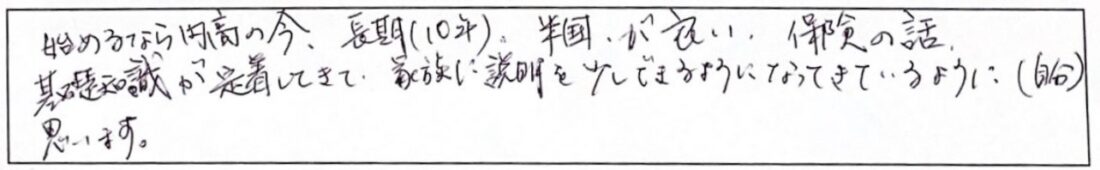 保険の選び方老後資金資産運用初心者オトナ女子のためのお金の勉強会(マネー女子会)始めるなら円高の今、長期(10年)、米国が良い。保険の話、基礎知識が定着してきて、家族に説明を少しできるようになってきているように(自分)思います。