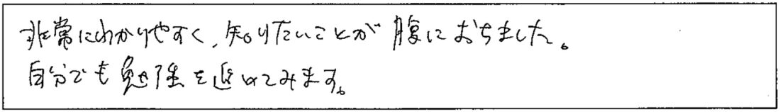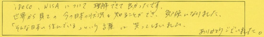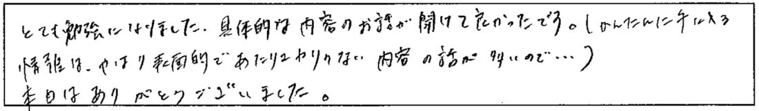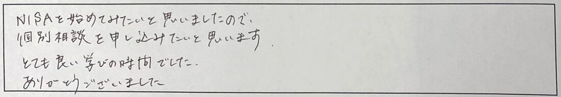 今後も、いろんなセミナーに参加していきたいです。また、事務所の方にもご相談に伺います。今後ともよろしくお願いいたします。