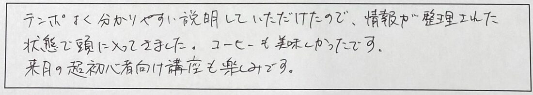 コーヒーも美味しかったです。来月の超初心者向け講座も楽しみです。