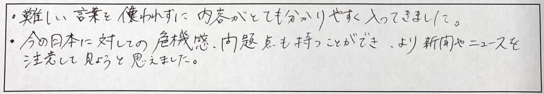 ・今の日本に対しての危機感、問題点も持つことができ、より新聞やニュースを注意して見ようと思えました。