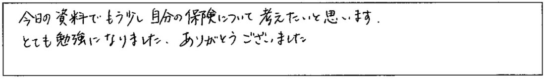 変額保険医療・がん保険保険の選び方老後資金家族信託認知症相続40代からのソロ活女子のためのマネーレッスン♪(おひとりさま)いつもお世話になっております。ソロ活参考になりました。介護、相続なども勉強していきたいです。次回のセミナーを楽しみにしております。
