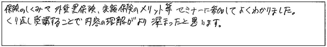 保険の選び方老後資金資産運用初心者ウィンターマネースクール(生命保険の基礎)保険のしくみや外貨建保険、変額保険のメリット等セミナーに参加してよくわかりました。くり返し受講することで内容の理解がより深まったと思います。