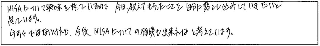今すぐではないけれど、今後、NISAについての相談も出来ればと考えています。