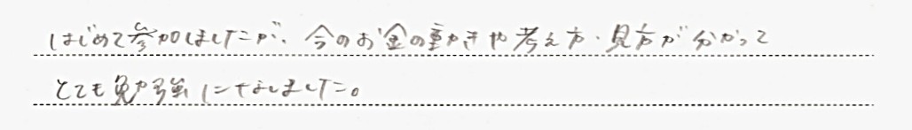 iDeCoNISA投資信託マネー中級者向け!経済、株価、金利、為替、税金、投資信託を学ぶはじめて参加しましたが、今のお金の動きや考え方、見方が分かってとても勉強になりました。