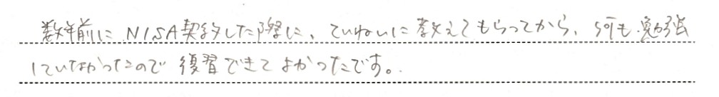 保険の選び方老後資金NISA投資信託資産運用初心者初心者向けマネー基礎講座~NISAのメリット・デメリット~まったくをもって、分からなかった事が、分かりました。細かい事は個別相談の際に確認、教えていただきたいと思います。ありがとうございます。