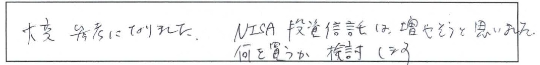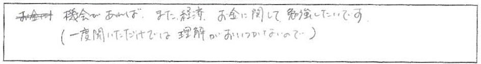 老後資金遺言介護認知症相続60歳からのマネープラン基礎講座(老後資金・終活・相続)こういうセミナーは初めてでしたが、大変参考になりました。ありがとうございました。