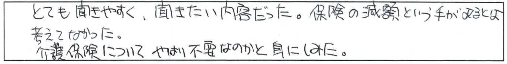 変額保険医療・がん保険保険の選び方初心者向けマネープラン基礎講座(生命保険の有効活用、見直し方法、税金)とても聞きやすく、聞きたい内容だった。保険の減額という手があるとは考えてなかった。介護保険についてやはり不要なのかと身にしみた。