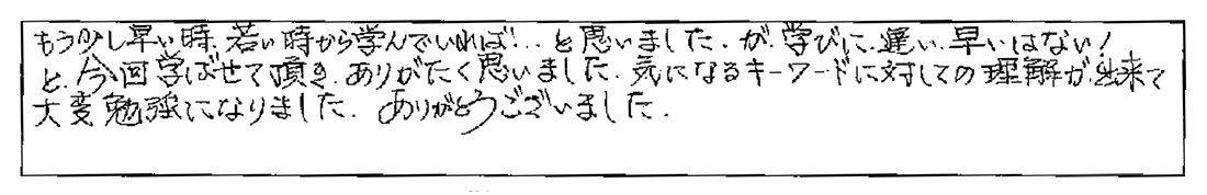 先生の説明がとてもわかり易くあっという間の講座でした。よくわかりました。またお話を聞きたいと思いました。