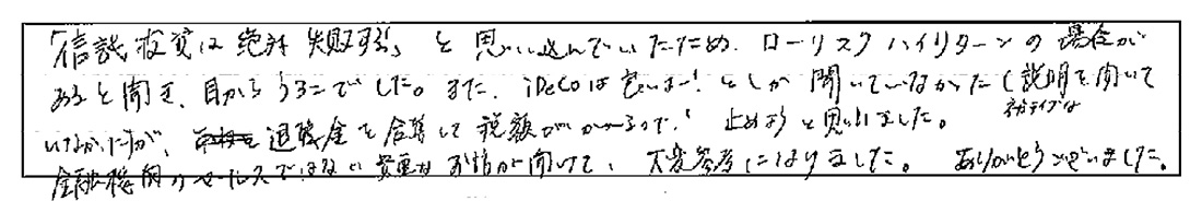 金融機関のセールスではない貴重なお話が聞けて、大変参考になりました。ありがとうございました。