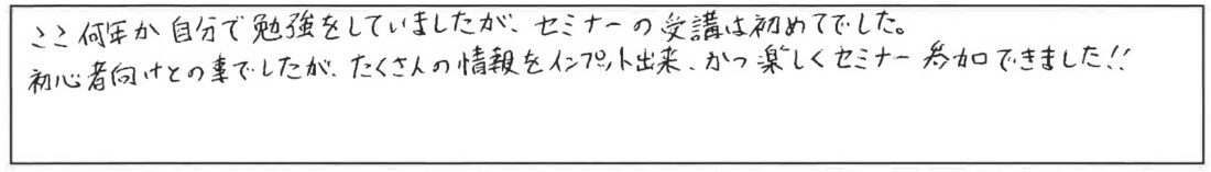 初心者向けとの事でしたが、たくさんの情報をインプット出来、かつ楽しくセミナー参加できました!