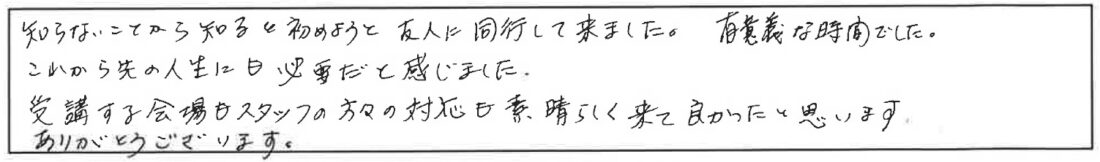 受講する会場もスタッフの方々の対応も素晴らしくて来て良かったと思います。ありがとうございます。
