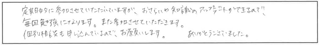 担当FPより最新の情報をアップデートしていきますので、定期的に参加されてもご満足いただけるように工夫していきたいと思います。 -