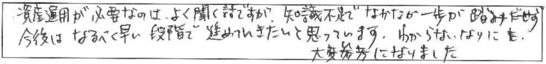 今回は基本的復習ができ、”50代”からでもまだ遅いことはなく、金利、複利や税制優遇等を利用して資産運用を地道に行っていく重要性を再認識しました。ありがとうございました! -