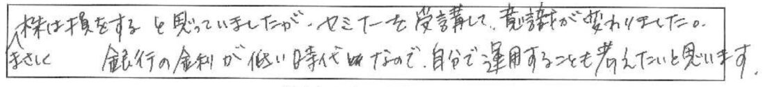 金融機関のセールスではない貴重なお話が聞けて、大変参考になりました。ありがとうございました。