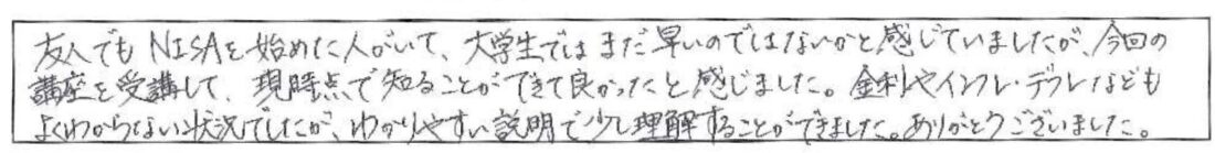 保険の選び方老後資金資産運用初心者オトナ女子のためのお金の勉強会友人でもNISAを始めた人がいて、大学生ではまだ早いのではないかと感じていましたが、今回の講座を受講して、現時点で知ることができて良かったと感じました。金利やインフレ・デフレなどもよくわからない状況でしたが、わかりやすい説明で少し理解することができました。ありがとうございました。